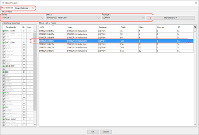 Запускаємо CubeMX. Створюємо новий проект "New Project". В вікні, що з'явиться обираємо свій мікроконтролер, вкладка "MCU Selector". Або плату розробника, вкладка "Board Selector". На малюнку позначено червоним "1". CubeMX не підтримує плату розробника STM32VLDiscovery, але мікроконтролер в списку є, так що обираємо "MCU Selector" і прямуємо далі. Там де на малюнку позначено червоним "2" обираємо серію "Series", лінійку "Lines" і так далі. З списку обираємо свій мікроконтролер STM32F100RBTx - позначено червоним "3".